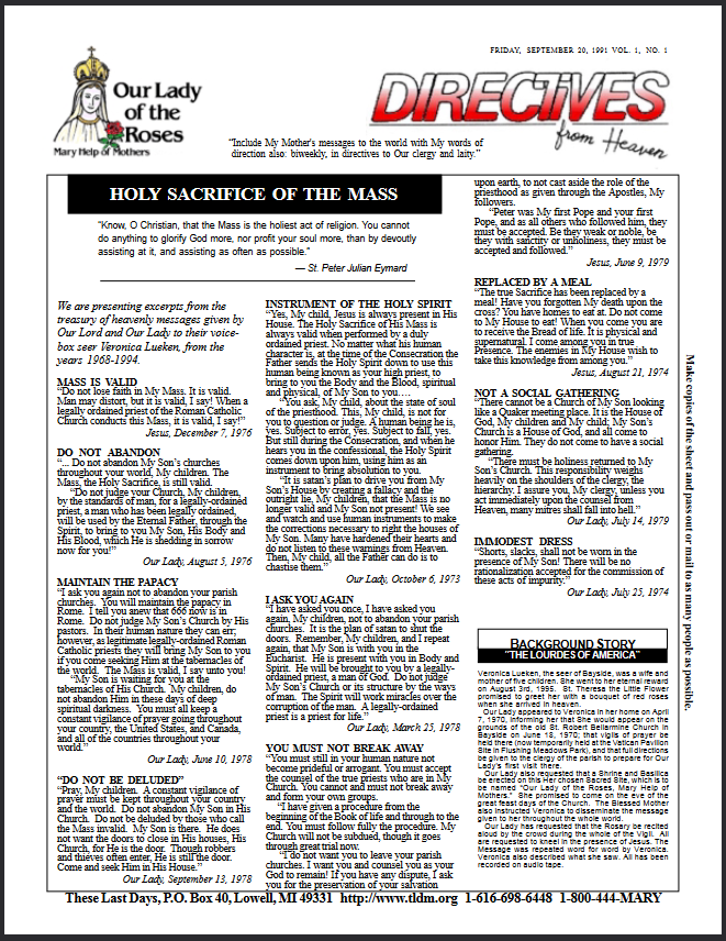 The Directives from Heaven are a collection of one-page fliers quoting the messages of Our Lady of the Rose by topic.